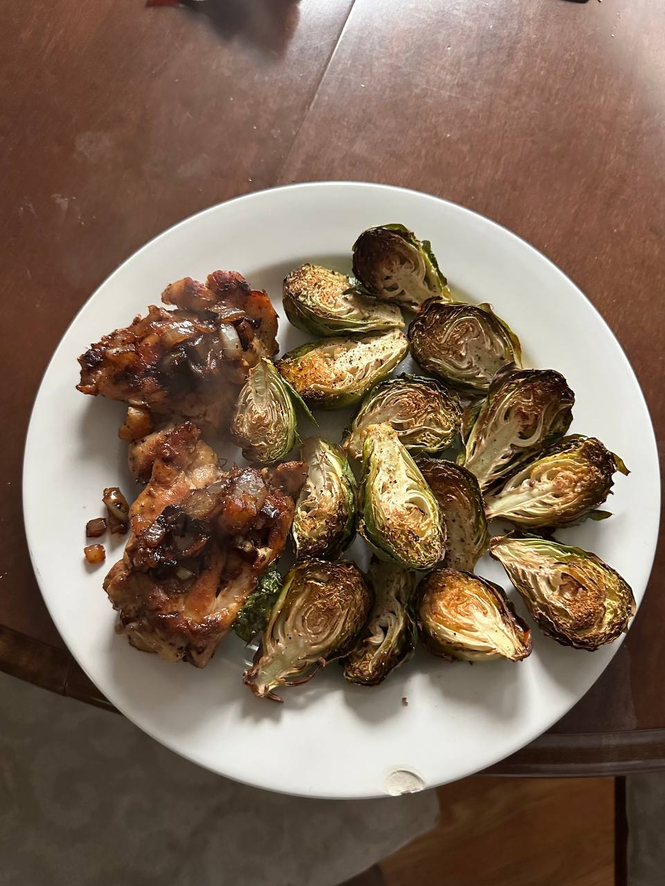 Last week I bought a bag of brussels sprouts in order to force myself to cook them before they went bad. I love brussels sprouts, probably my favorite vegetable along with collard greens, which is funny because they are derived from the same plant, wild mustard, and have been bread for thousands of years to select for different qualities. This was a sort of motivation treat for me to get back in the swing of cooking more. I also needed to make room in the freezer, and the package of chicken thighs, which has been there since October, was fairly large. I diced up an onion, chopped a few cloves of garlic, pan fried them along with the chicken thighs, and threw in a handful of spices along the way. While that cooked on the stove, I roasted the halved brussels sprouts in the oven. I used a little over half the bag, and exactly half the chicken thighs and I ate it for 2.5 meals. When I got home today, I still had a lot of energy and I was mildly hungry, so I figured why not cook up the rest. I tweaked a few things, longer and hotter on the brussels sprouts and had to get the pan hotter to get a better sear on the chicken. I took some photos along the way: